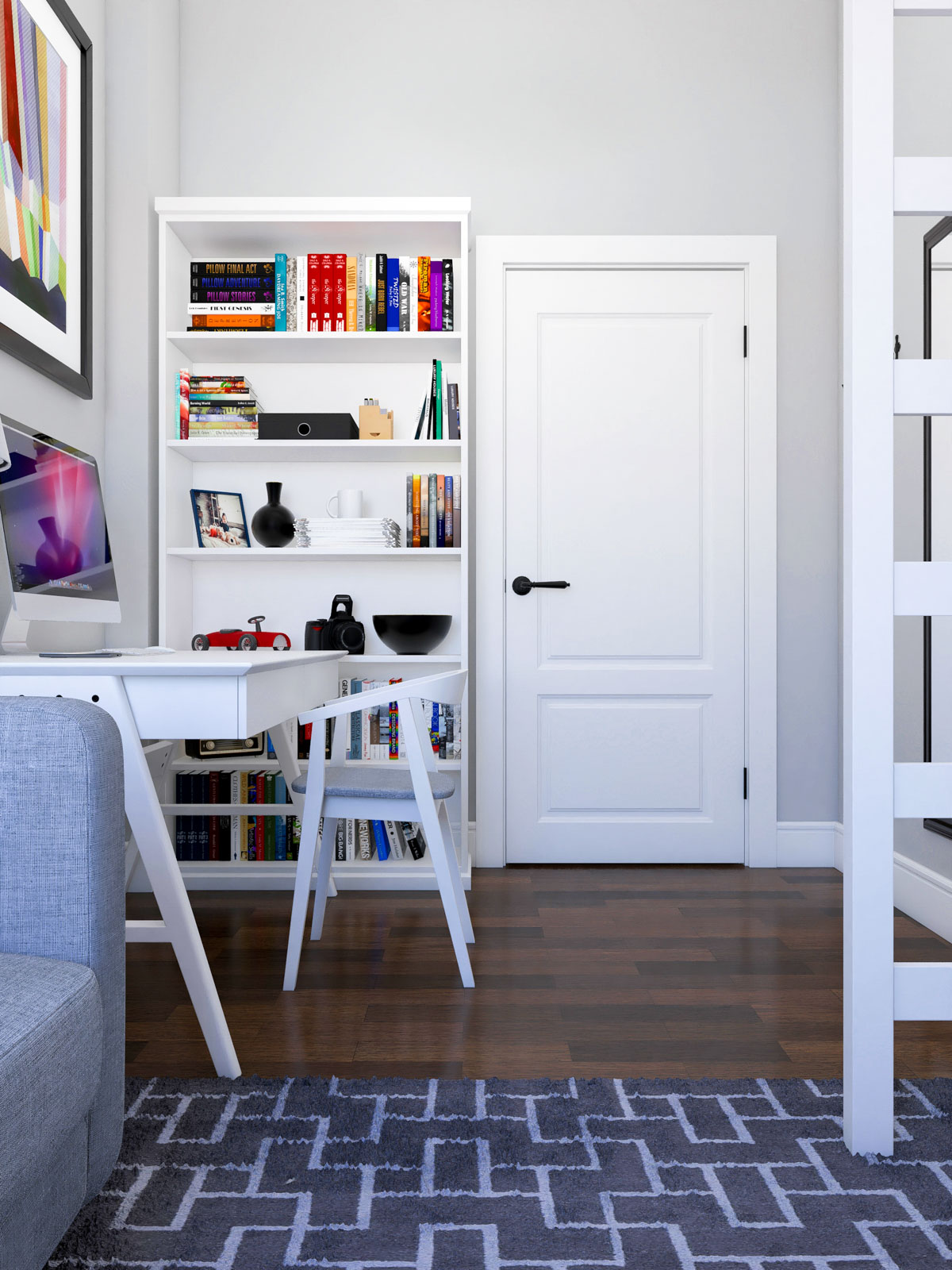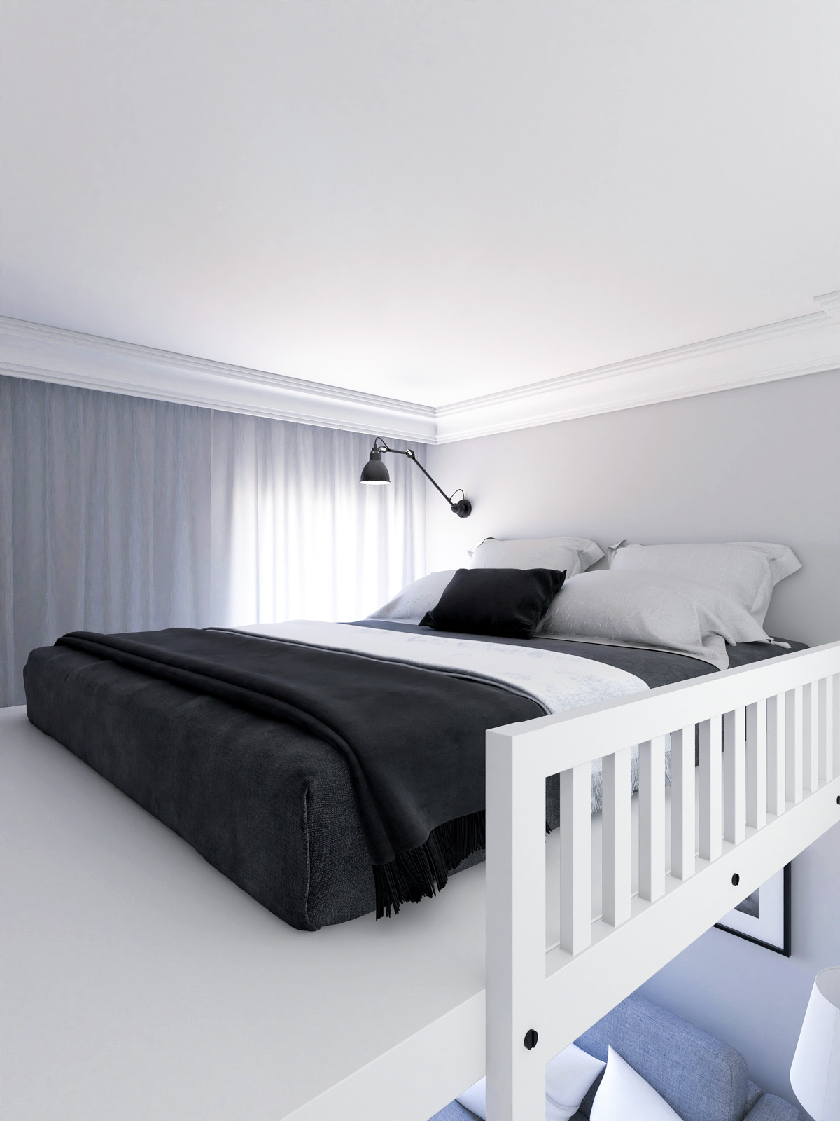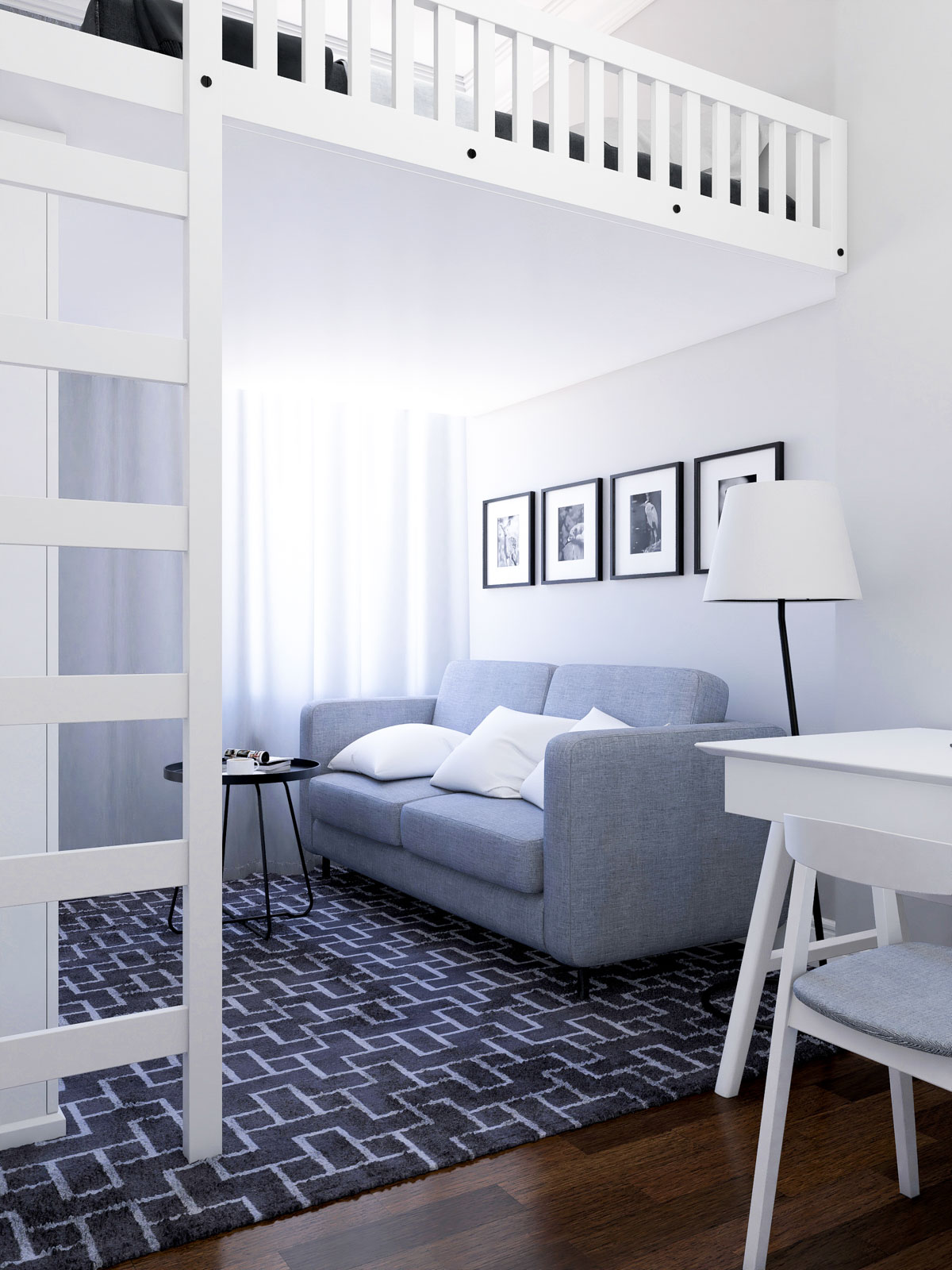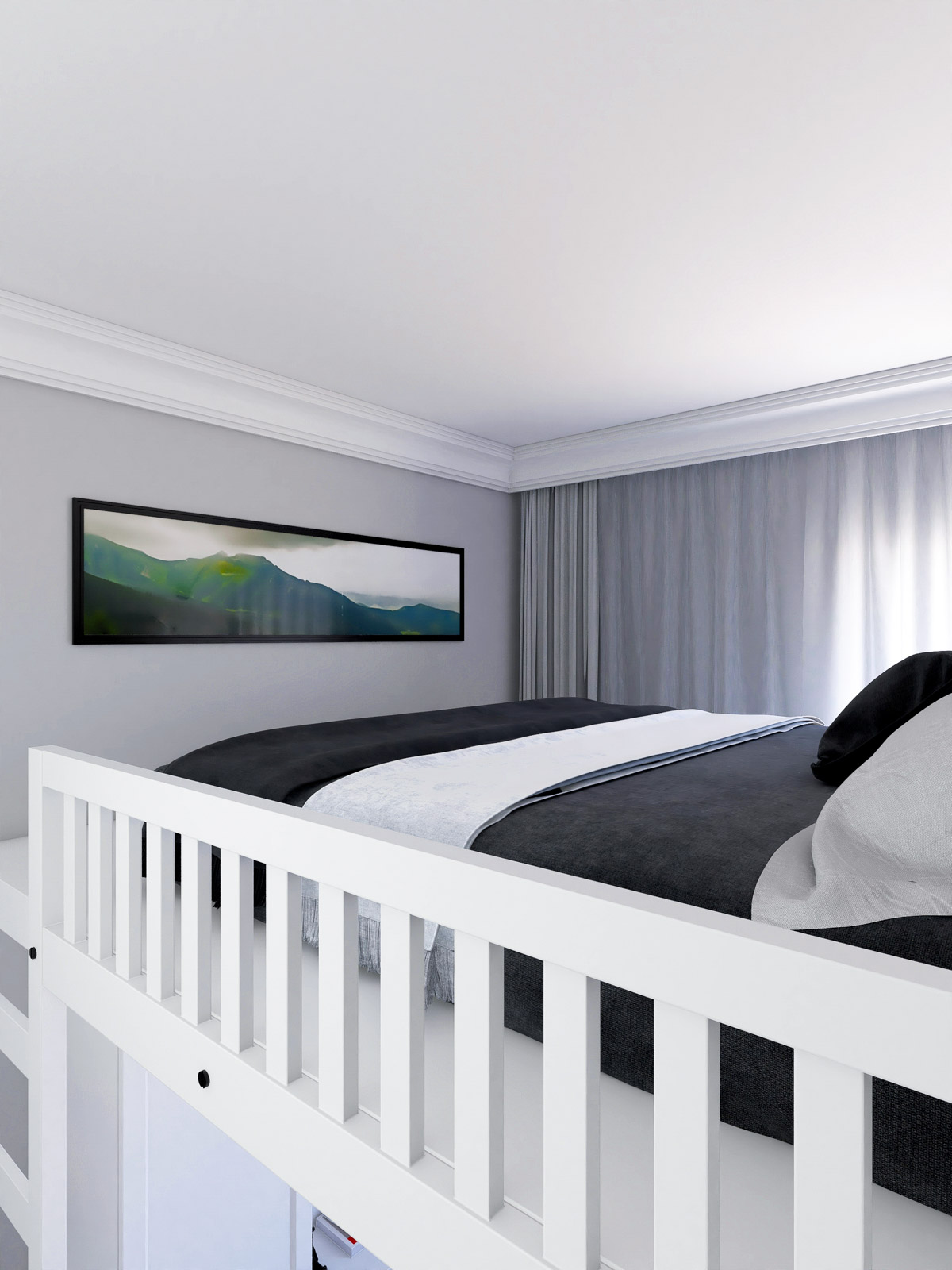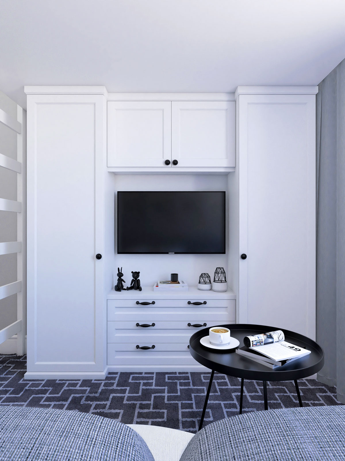 This bedroom design offers a holistic spatial concept that efficiently integrates areas for studying, resting, and socializing within a limited volume. The workspace positioned at the entrance supports focus and productivity, while the vertical division of the space near the window creates a sleeping area on the upper level and a multifunctional living zone for seating and TV use below. The integrated storage unit also functions as a wardrobe, enhancing spatial efficiency. A light color palette combined with clean furniture lines gives the room a bright, balanced, and timeless character.